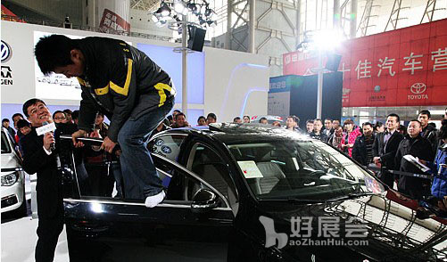 展會(huì)上的參展商們?yōu)榱送其N(xiāo)自己的汽車(chē)各想奇招。在會(huì)展中心的一展區(qū)內(nèi),參展商邀請(qǐng)參觀(guān)者爬上汽車(chē)表演“活人踩車(chē)”,以展示本車(chē)的牢固性,從而來(lái)招攬客戶(hù)購(gòu)車(chē)。