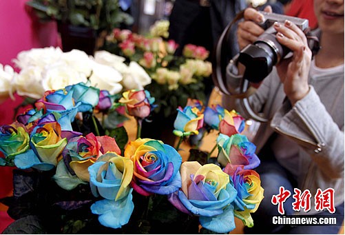 4月11日,第十四屆中國(guó)國(guó)際花卉園藝展覽會(huì)在北京開幕。展覽匯集了四百余家中外知名企業(yè),展出面積二萬三千平方米,同期舉辦四十場(chǎng)專業(yè)講座。圖為展出的進(jìn)口“七彩玫瑰”吸引觀眾。