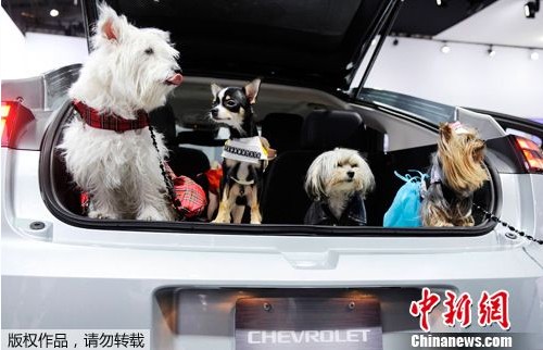 2012年4月11日,美國(guó)紐約車展上,雪佛蘭廠商為了宣傳汽車的安全性,請(qǐng)來(lái)幾只小狗做起了車模。(來(lái)源:中新網(wǎng))