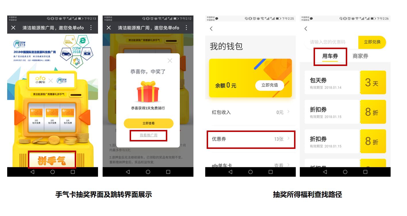 熟悉小黃車(chē)的用戶(hù)都知道,月卡和騎行券一直是ofo的固定福利模式,而全新上線(xiàn)的手氣卡,則將ofo的福利資源進(jìn)行了全面整合。手氣卡是一個(gè)包含月卡、周卡、騎行券、折扣券等多重優(yōu)惠福利的大禮包,用戶(hù)通過(guò)老虎機(jī)搖獎(jiǎng)即可隨機(jī)獲得不同種類(lèi)的優(yōu)惠獎(jiǎng)品。參與2018中國(guó)國(guó)際清潔能源科技推廣周與ofo小黃車(chē)聯(lián)名手氣卡的方式非常簡(jiǎn)單,活動(dòng)期內(nèi),用戶(hù)可通過(guò)推廣周官方微博、微信、EDM等平臺(tái)找到活動(dòng)消息: