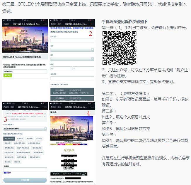 HOTELEX Beijing 2018參展預(yù)登記正火熱開展,在此特別提醒請及時(shí)預(yù)登記。想了解更多展會(huì)信息,請微信搜索并關(guān)注公眾號(hào)“上海國際酒店及餐飲業(yè)博覽會(huì)“,了解相關(guān)信息。