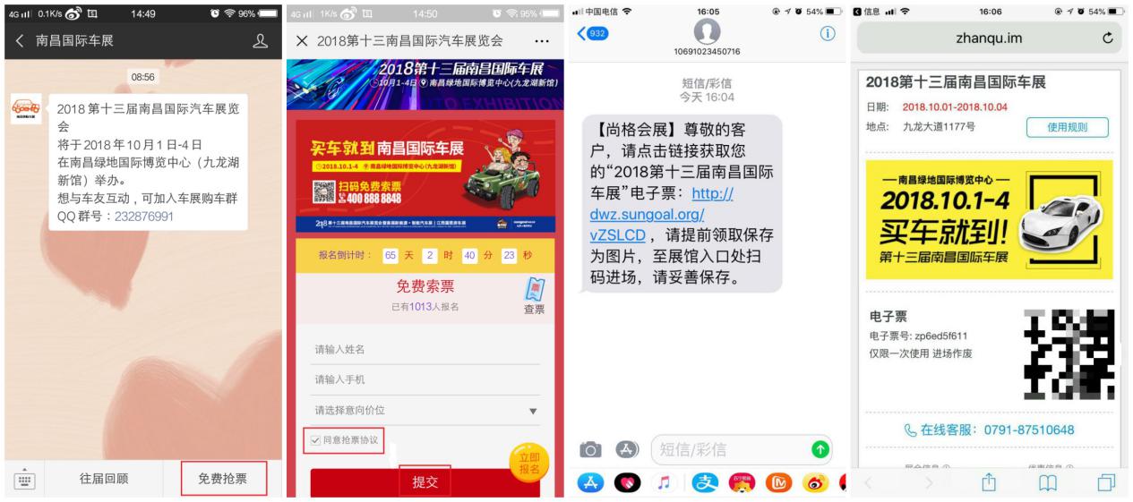 關(guān)注“南昌國(guó)際車展”微信號(hào),點(diǎn)擊下方【免費(fèi)搶票】進(jìn)入頁(yè)面提交信息即可。官方客服電話回訪核對(duì)信息后,電子門票直接發(fā)送到您的手機(jī)上,點(diǎn)開鏈接查看電子票;入場(chǎng)前可以進(jìn)入官方微信【南昌國(guó)際車展】點(diǎn)擊菜單【票證查詢】進(jìn)入查詢頁(yè)面即可打開電子票圖片;