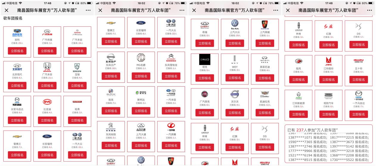 1、即日起至9月30日,通過微信關(guān)注“南昌國(guó)際車展”,點(diǎn)擊【萬(wàn)人砍車團(tuán)】按鈕進(jìn)入專題,選擇喜歡的汽車品牌即可免費(fèi)報(bào)名參加“南昌國(guó)際車展官方萬(wàn)人砍車團(tuán)”活動(dòng)(每人限報(bào)一個(gè)砍車團(tuán));