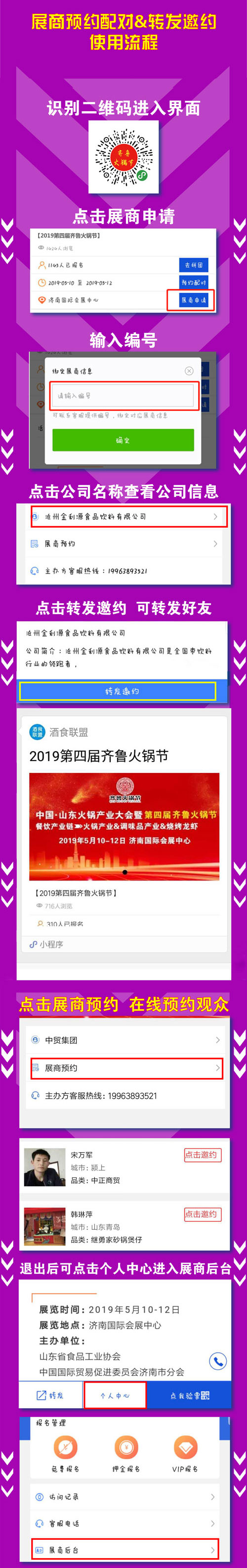 展商通過(guò)小程序報(bào)名后可以提前查看報(bào)名觀眾并與觀眾預(yù)約,展商還可以轉(zhuǎn)發(fā)邀約觀眾前來(lái)參加本屆齊魯火鍋節(jié)。預(yù)約配對(duì)與轉(zhuǎn)發(fā)邀約流程如下: