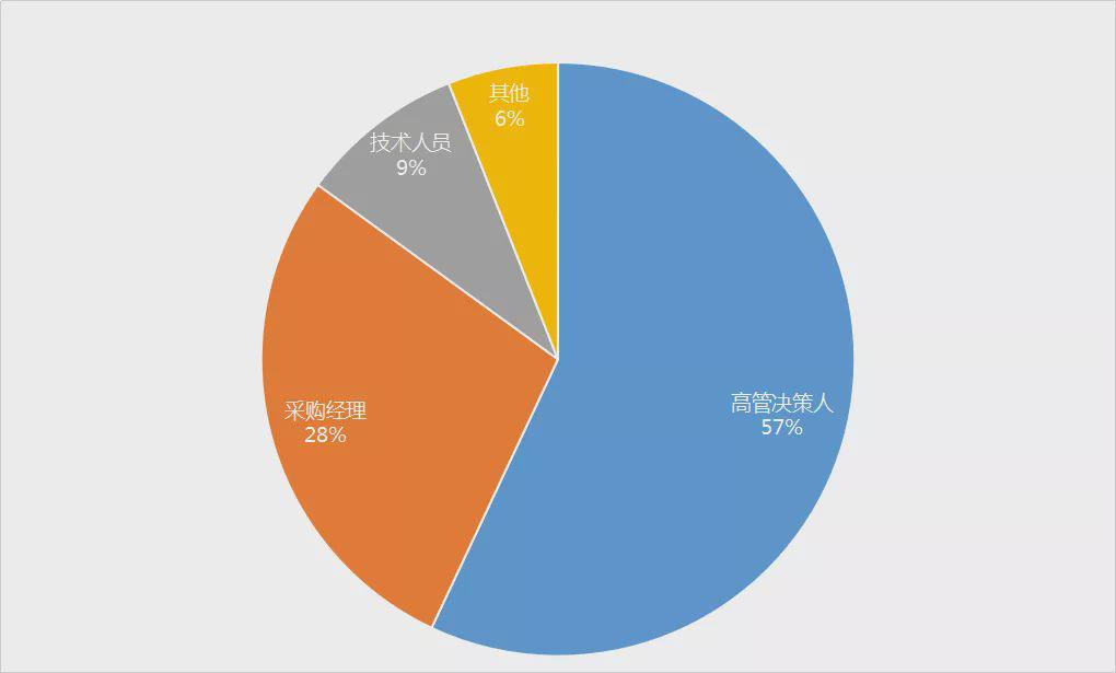 在本屆具有商業(yè)價值的專業(yè)觀眾共計49012人次,其中占比較多的高管決策人,達到57%;其次,采購經理占比28%、技術人員占比9%,其它占比6%。