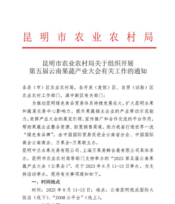昆明市農(nóng)業(yè)農(nóng)村局關(guān)于組織開展第五屆云南果蔬產(chǎn)業(yè)大會的通知