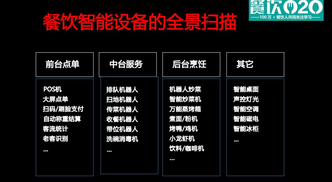 《2023年餐飲設(shè)備智能化發(fā)展報告》對餐飲業(yè)的智能設(shè)備進行了全景掃描,根據(jù)流程環(huán)節(jié)分為四大類:前臺點單、中臺服務、后臺烹飪、其它。餐飲如何做設(shè)備智能化?關(guān)鍵就是:前臺極致個性化,后臺極致效率化。