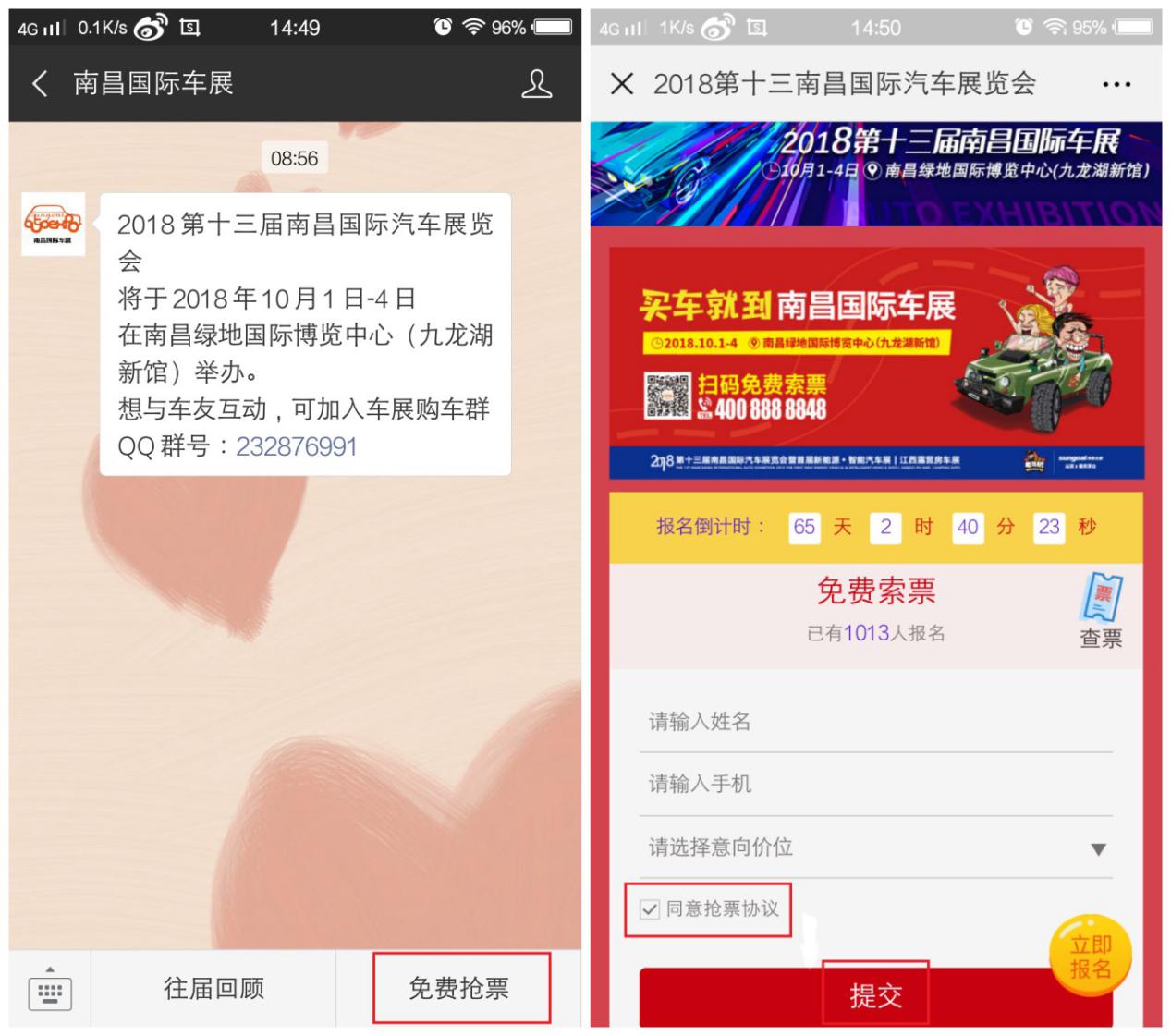 另外本屆南昌國際車展的免費(fèi)搶票福利已全面上線。只需微信關(guān)注“南昌國際車展”,點(diǎn)擊菜單欄【免費(fèi)搶票】進(jìn)入頁面提交信息即可。